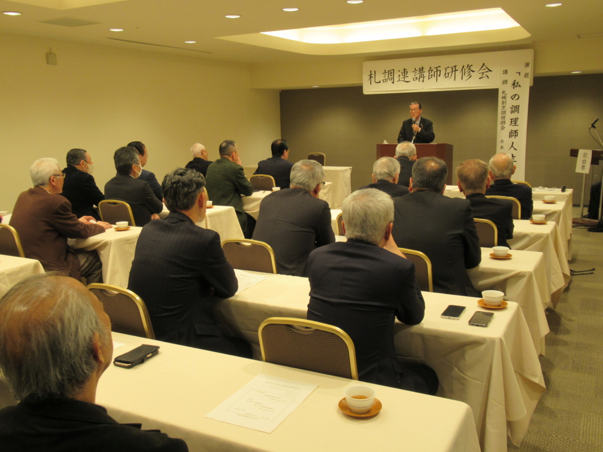 1月28日、令和7年度第2回札調連認定講師研修会がホテルポールスター札幌で開催されました。研修会には札調連認定講師、札調連役員、札幌市名誉調理師など32名が参加し、司会は札幌そば麵類研究会の佐藤元治氏が務め、札調連認定講師委員会の鈴木裕一郎委員長の挨拶で始められました。今回の講師は、札幌割烹調理師会会長の葛西利男氏で、「私の調理師人生」と題して、約1時間の講演が行われました。葛西利男氏は高校を卒業後、すぐに調理の仕事には就かず、横浜の重工業の会社で1年間働いた後、職場で知り合った先輩と意気投合し一年発起して敢えて辛い飲食の世界へ進む決意をし、共に調理の世界に入ったそうです。その後、横浜、吉祥寺、金沢で腕を磨き、27歳の時に北海道に戻り、64歳まで調理師として活躍され、現在も調理師会の役員として業界と後進のためにご活躍されています。なお、葛西利男氏のお話は、今後、札調連から発行される冊子「私の調理師人生」第3号に掲載される予定です。